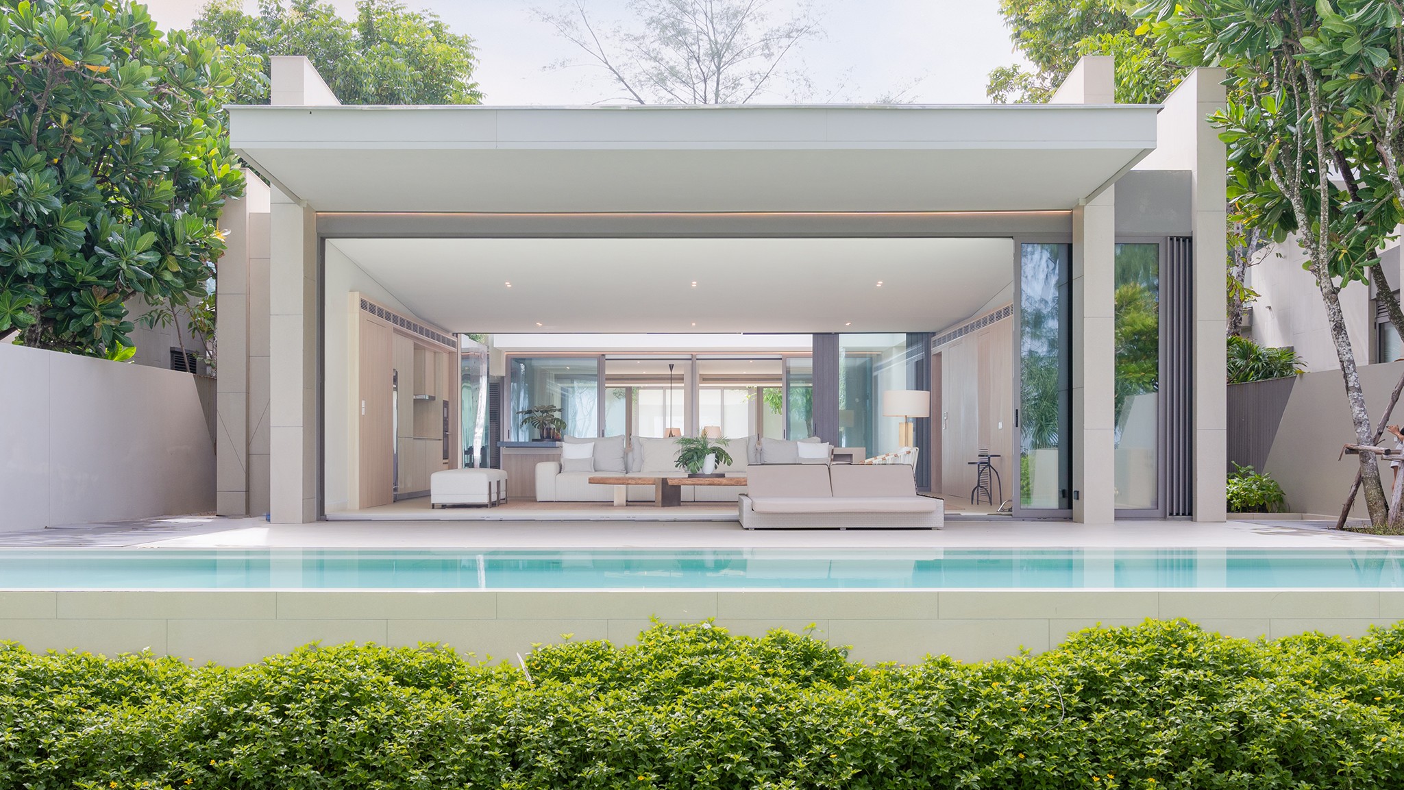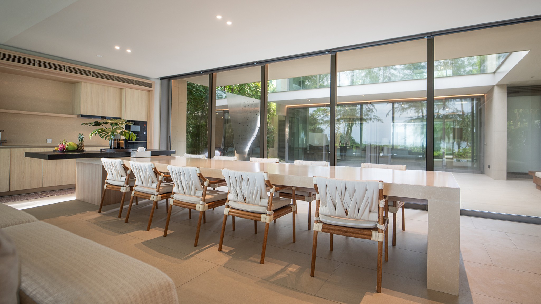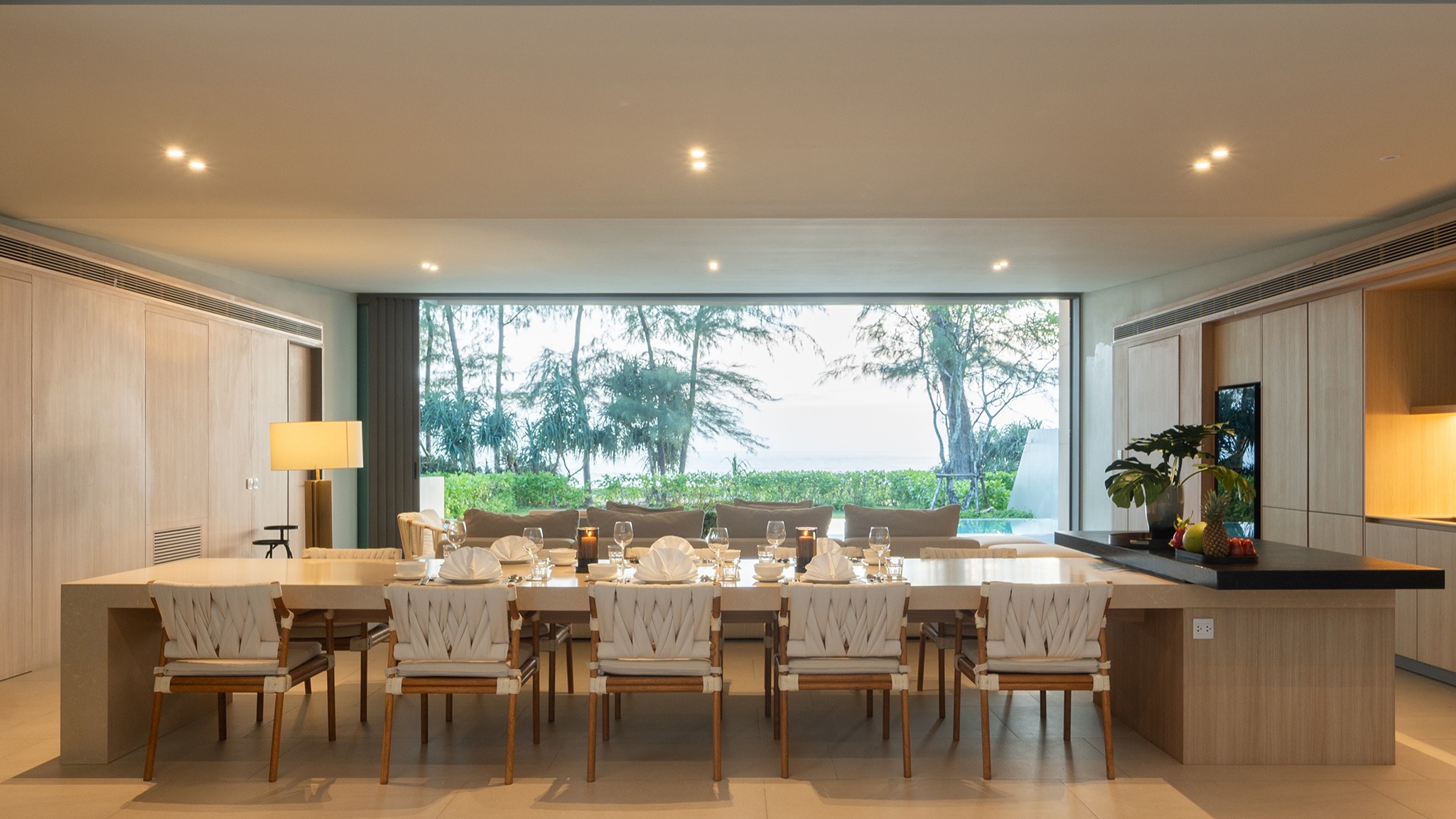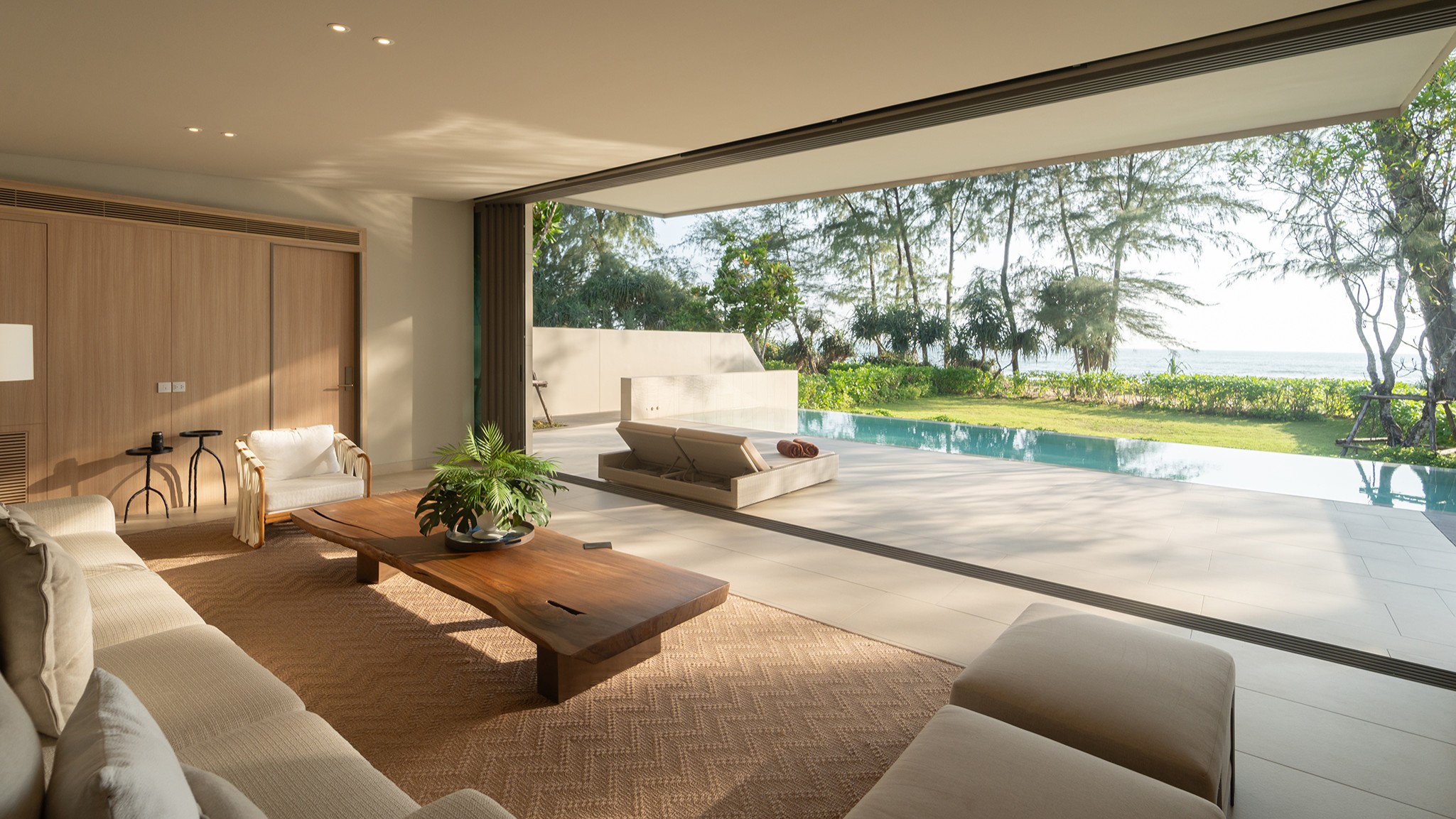Designed with open living in mind, the villa features three spacious bedrooms with en-suite bathrooms, stylish interiors, and large glass doors that invite in the sea breeze. Each room is thoughtfully furnished for maximum comfort, while the open-plan living and dining areas flow overlooking the beach.